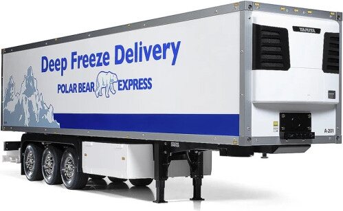 A common sight on the roads of Europe, the 3-axle refrigeration "reefer" trailer has been added to Tamiya"s unique lineup of 1/14 R/C Tractor Truck products. Featuring an aluminum frame with durable ABS panels, this trailer also has such details as a refrigeration unit and a tailgate that can be fully opened.