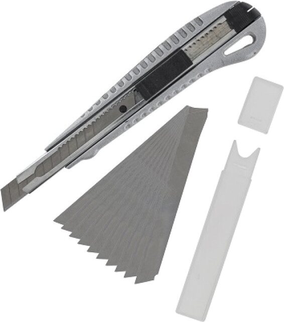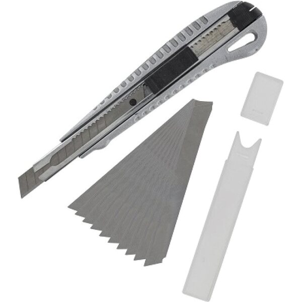 Toote kirjeldusRetractable, Zinc Alloy Snap—Off Knife 140mm, fitted with 12 section blade, 9mm x 0.3mm. Includes auto lock button, blade removing device & hanging hole. Ideal for Modelling, Art, Craft & smaller DIY tasks