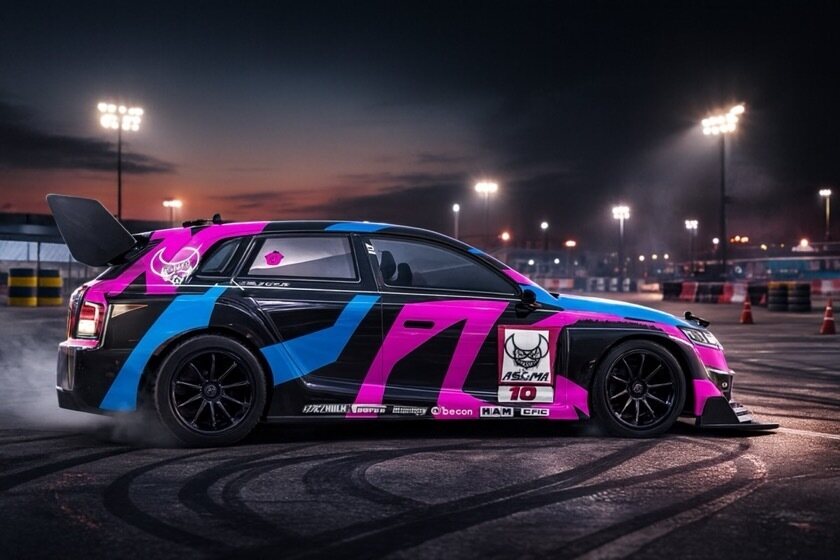 Mukana tulee myös laaja tarra‑arkki sekä sponsoritarroja, joilla auton ulkonäön voi viimeistellä täysin oman maun mukaan.