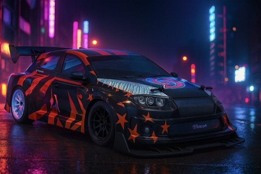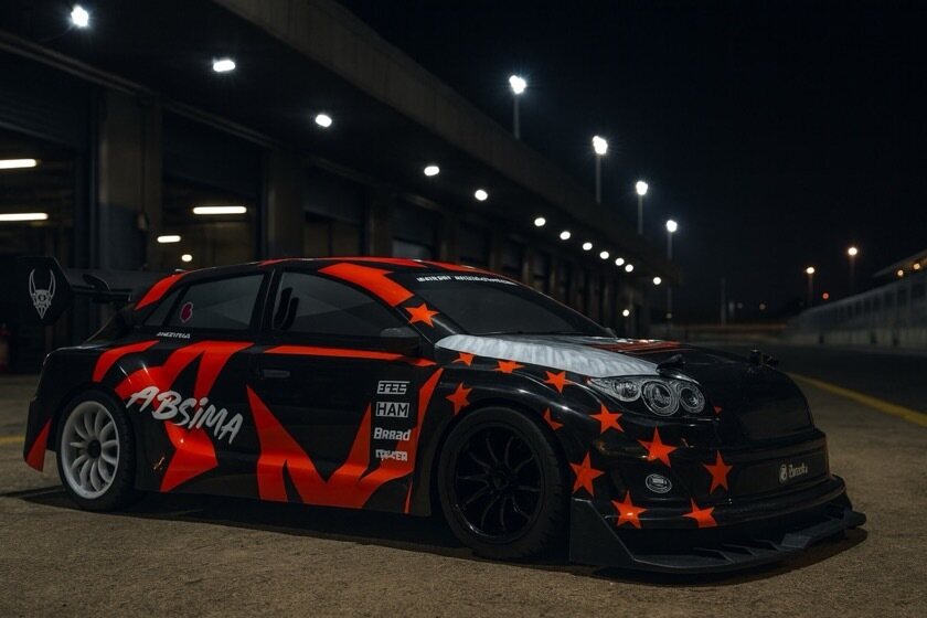 Mukana tulee myös laaja tarra‑arkki sekä sponsoritarroja, joilla auton ulkonäön voi viimeistellä täysin oman maun mukaan.