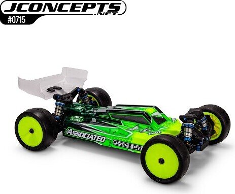 In 1:10th buggy racing, cab placement is critical, the forward bias cab with powerful windshield angle conquers terrain ranging from dirt, sealed synthetic, carpet, to astroturf. The JConcepts body really does it all, with chamfered side-pods blended perfectly into the cab and broad rear mounting ledge, the F2 is a winner. The body includes a tight fit around the chassis providing a compete shape that holds tightly and the user can also use (not included) hook and loop tape to secure the body to the chassis.