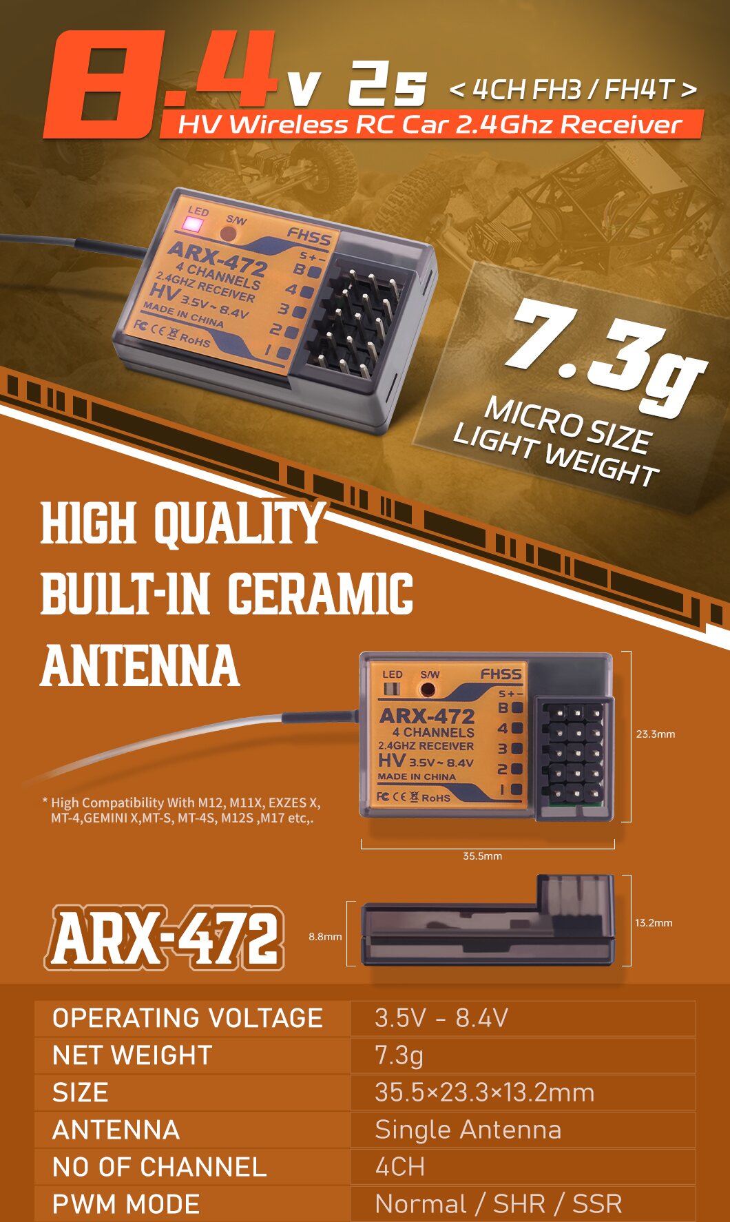 Sanwa ARX-472 on suorituskykyinen ja luotettava 4-kanavainen pintakäyttöön tarkoitettu vastaanotin, joka on suunniteltu erityisesti kilpa- ja harrastekäyttöön. Se tarjoaa nopean vasteen, vakaan signaalin ja laajan yhteensopivuuden Sanwan huippuluokan ohjainten kanssa.