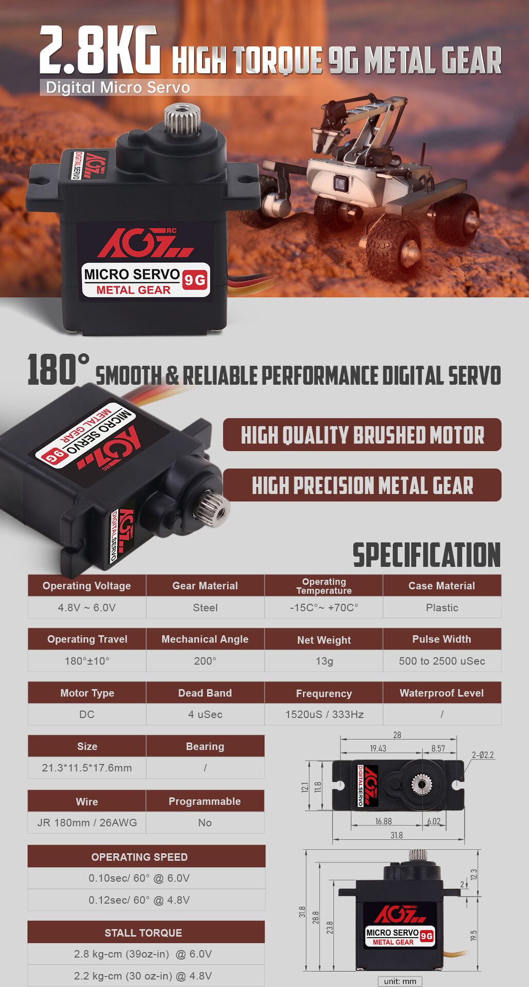 AGFRC B11DLS on tehokas ja luotettava 180 asteen digitaalinen micro‑servo, joka tarjoaa erinomaisen suorituskyvyn pienessä koossa. Teräsrattaat, laadukas harjallinen moottori ja tarkka digitaalinen ohjain tekevät siitä erinomaisen valinnan autoihin, lentokoneisiin, helikoptereihin ja robottiprojekteihin.